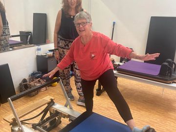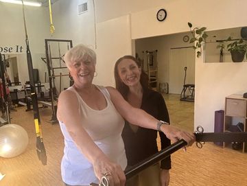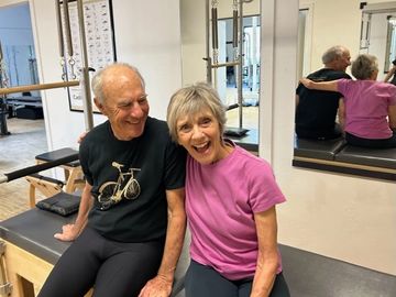 Private Pilates instruction for two people tailored to their specific needs.